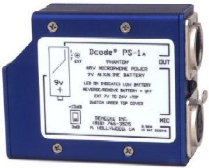 The Dcode? PS-1A is a low noise, Phantom 48 volt microphone power supply. The PS-1A works with one 9 volt battery and has enough power to run high current microphones. The small size, light-weight, rugged construction and very low noise make the PS-1A a natural for powering microphones feeding DAT machines, radio mics, tape machines, and mixing panels. Long battery life and a bright LED low battery indicator ensure that the microphone is properly powered during your recording session.